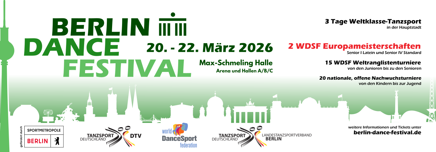 Vom 20. bis 22. März wird die Max-Schmeling-Halle wieder zur Tanzsportarena und heißt Paare aus aller Welt zu 15 Weltranglistenturniere, 2 Europameisterschaften und jeder Menge DTV-Turniere für Nachwuchspaare der D-B Klasse in der Hauptstadt willkommen.