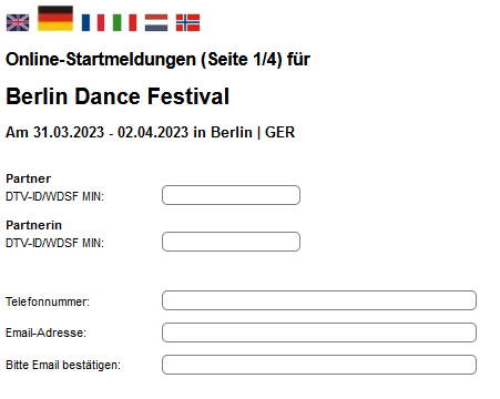 Für die Meldung ist eine gültige WDSF-Startlizenz erforderlich. Die Startmeldung selbst kann dann über die WDSF-MINs oder die DTV-ID-Nummern des Paares erfolgen.